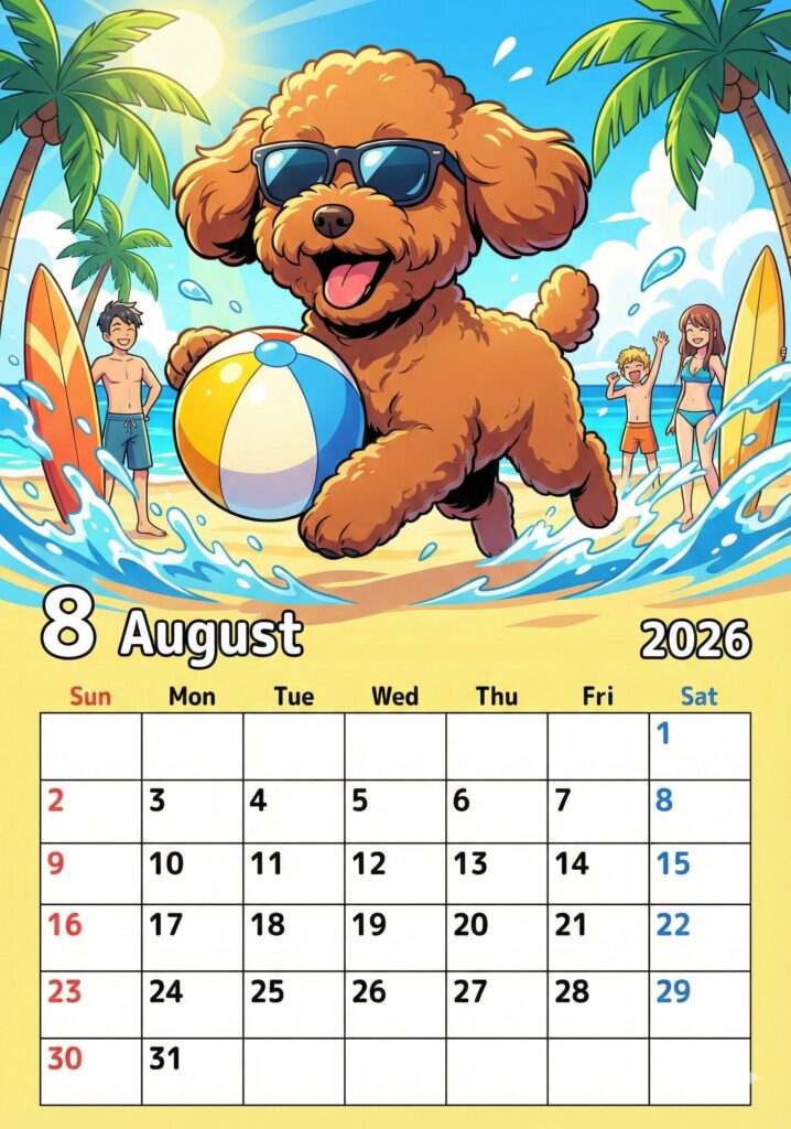 この写真のペットをキャラクター化して、2026年8月のカレンダーを作成してください。