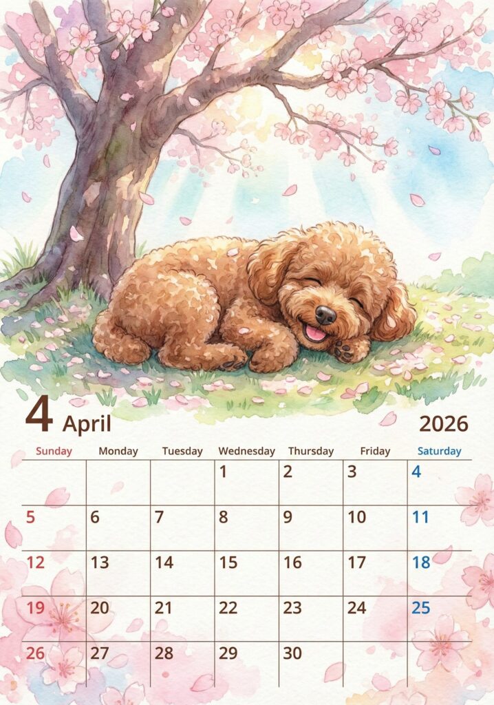 アップロードした写真のペットをモデルにしてください。2026年4月のカレンダー画像を作成してください。