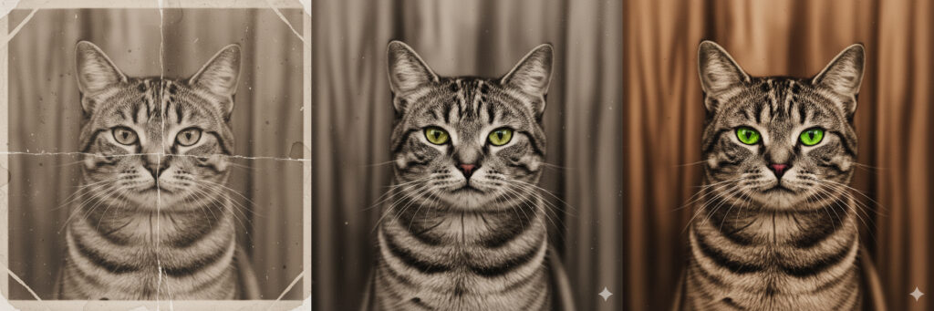 ②「色あせを補正、紙の汚れを取り、コントラストを回復」と指示。カラー化したい場合は「カラーにして」と追加で依頼。