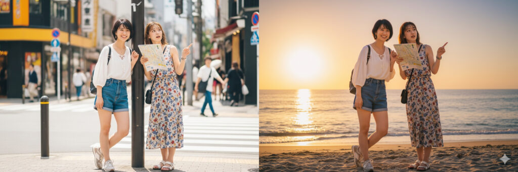 - 元写真をアップ → 「この写真を夕焼けのビーチにいているようにしてください」など指示。
