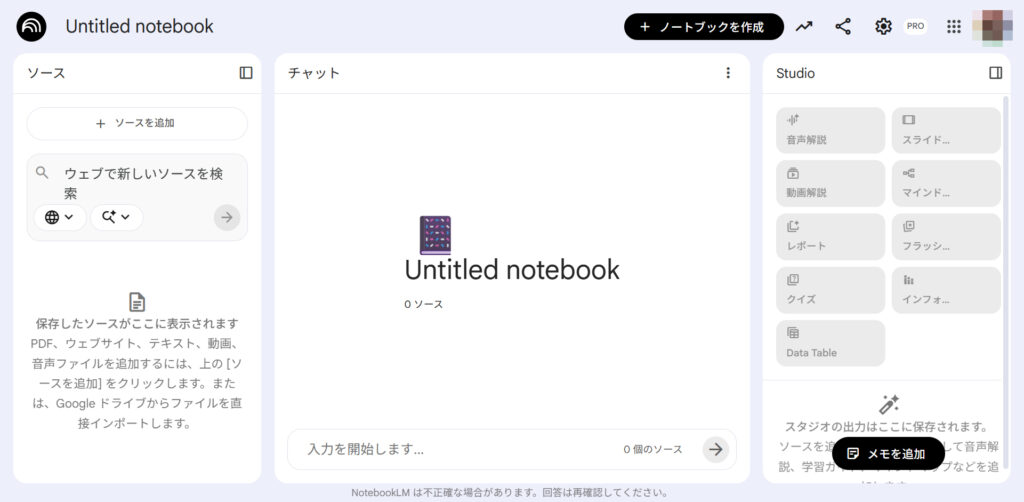 ※NotebookLMの操作画面。左側の「ソース」から資料をアップロードできる。