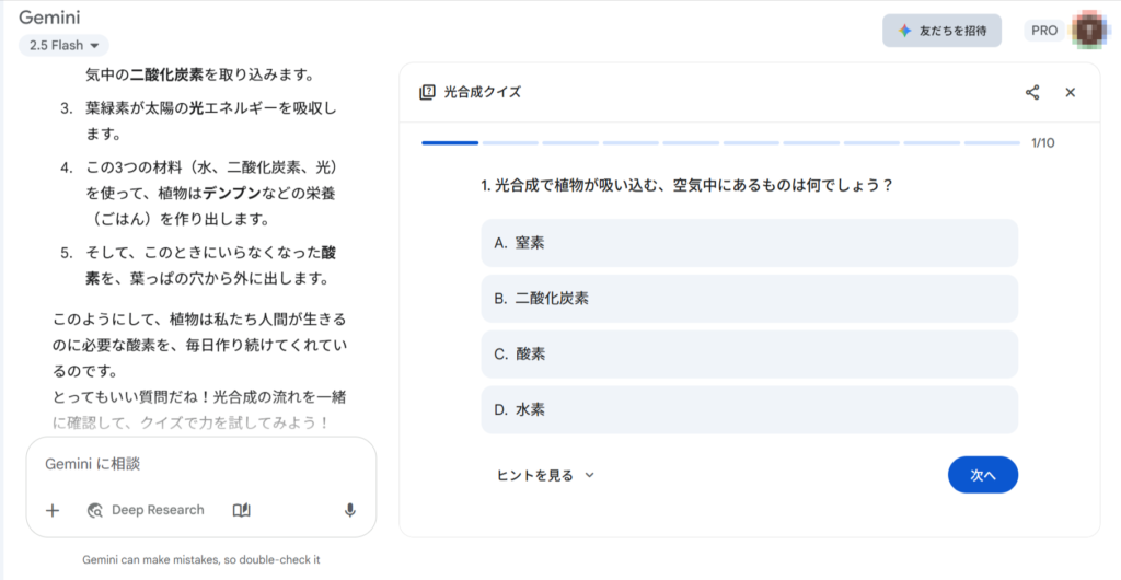 Geminiが図・箇条書き・クイズで段階的に理解を促進。