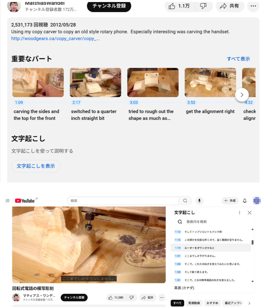 - わからない工程や繰り返し見たい工程がある場合は、概要欄の下部にある“「文字起こし」を表示”をクリック→動画の右側にタイムスタンプと文字起こしが表示される→右クリックで“日本語に翻訳”をクリック→該当行をクリックして該当箇所へジャンプ(Google Chromeを利用の場合)。