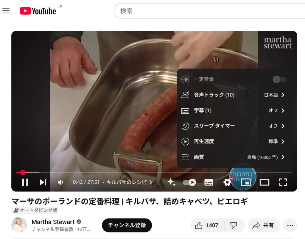 人気料理チャンネル「マーサのポーランドの定番料理 」はAuto Dubbing(自動翻訳)に対応している。